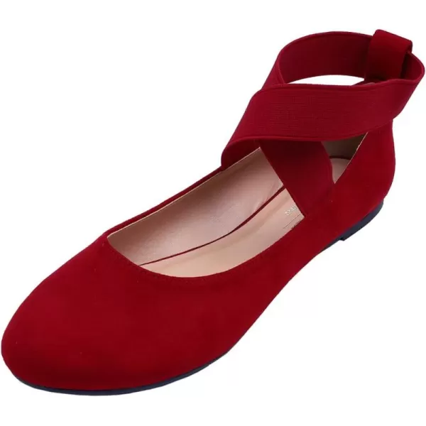 FEVERSOLE Women’s Fashion Elastic Ankle Strap Shoes Round Toe Ballet Flat(Red Faux Suede Ankle Strap)