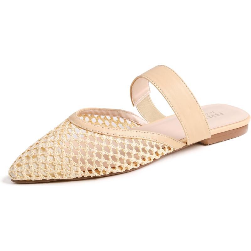 FEVERSOLE Pointed Toe Casual Slingback Flat Mules Women’s Fashion Buckle Strap Slide Summer Slippers(Beige Vegan Leather Mesh Strap)