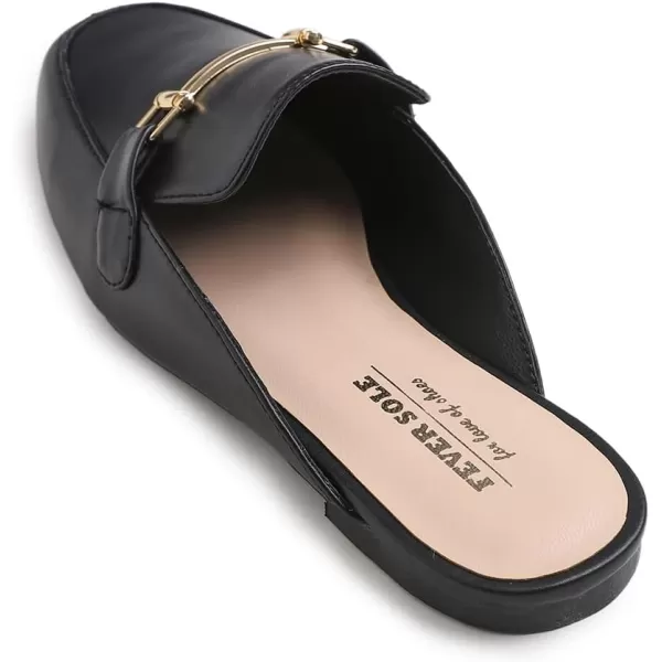 FEVERSOLE Women’s Fashion Deco Mules Slip On Backless Slide Flats(Black Plain Vegan Leather Golden Buckle)
