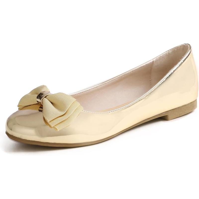 Feversole Women’s Round Toe Cute Bow Trim Ballet Flats(Mirror Gold Tri-bow)